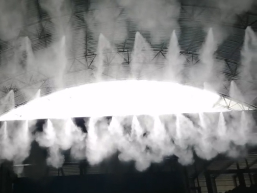 堆棚內(nèi)采用高壓微霧抑塵系統(tǒng),每個(gè)棚子根據(jù)現(xiàn)場(chǎng)實(shí)際情況進(jìn)行分區(qū)域獨(dú)立控制,堆棚頂部分區(qū)域、網(wǎng)格化布置微霧噴頭,要求能滿足堆棚整體抑塵。霧化顆粒范圍:10-50μm,微霧顆粒與無(wú)組織粉塵/揚(yáng)塵充分混合并形成含塵液滴,在自重的作用下沉降到地面,治理現(xiàn)場(chǎng)揚(yáng)塵。大門(mén)設(shè)計(jì)獨(dú)立的噴霧裝置,要求能夠獨(dú)立控制;當(dāng)運(yùn)輸車(chē)輛進(jìn)出入通過(guò)大門(mén)時(shí), 紅外線感應(yīng)器將信號(hào)傳輸給設(shè)備PLC來(lái)控制干霧抑塵系統(tǒng)工作,給大門(mén)進(jìn)行噴霧抑塵,并且噴霧時(shí)間可以調(diào)節(jié)。實(shí)現(xiàn)無(wú)人操作自動(dòng)抑塵,有效的防止車(chē)間內(nèi)灰塵通過(guò)大門(mén)外溢的現(xiàn)象。主機(jī)采用變頻自動(dòng)恒壓供水,主機(jī)工作壓力恒定為6-7MPA。(壓力值大小可調(diào)節(jié)),可在主機(jī)面板上直觀地觀察到進(jìn)水壓力和高壓出水工作壓力。
