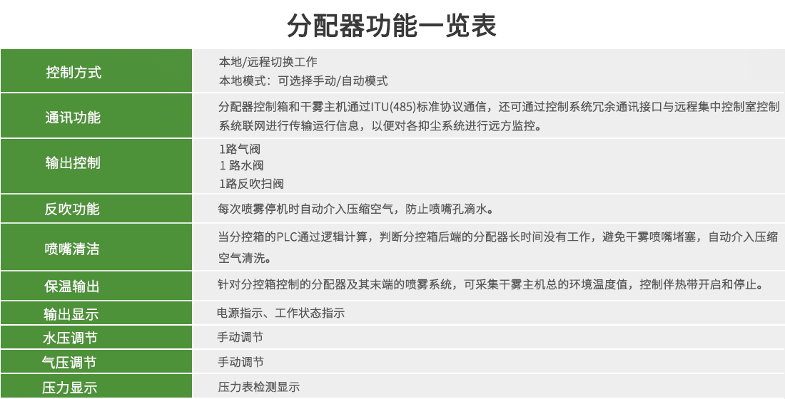 分配器控制箱和干霧主機(jī)通過ITU(485)標(biāo)準(zhǔn)協(xié)議通信,還可通過控制系統(tǒng)冗余通訊接口與遠(yuǎn)程集中控制室控制系統(tǒng)聯(lián)網(wǎng)進(jìn)行傳輸運(yùn)行信息,以便對(duì)各抑塵系統(tǒng)進(jìn)行遠(yuǎn)方監(jiān)控。